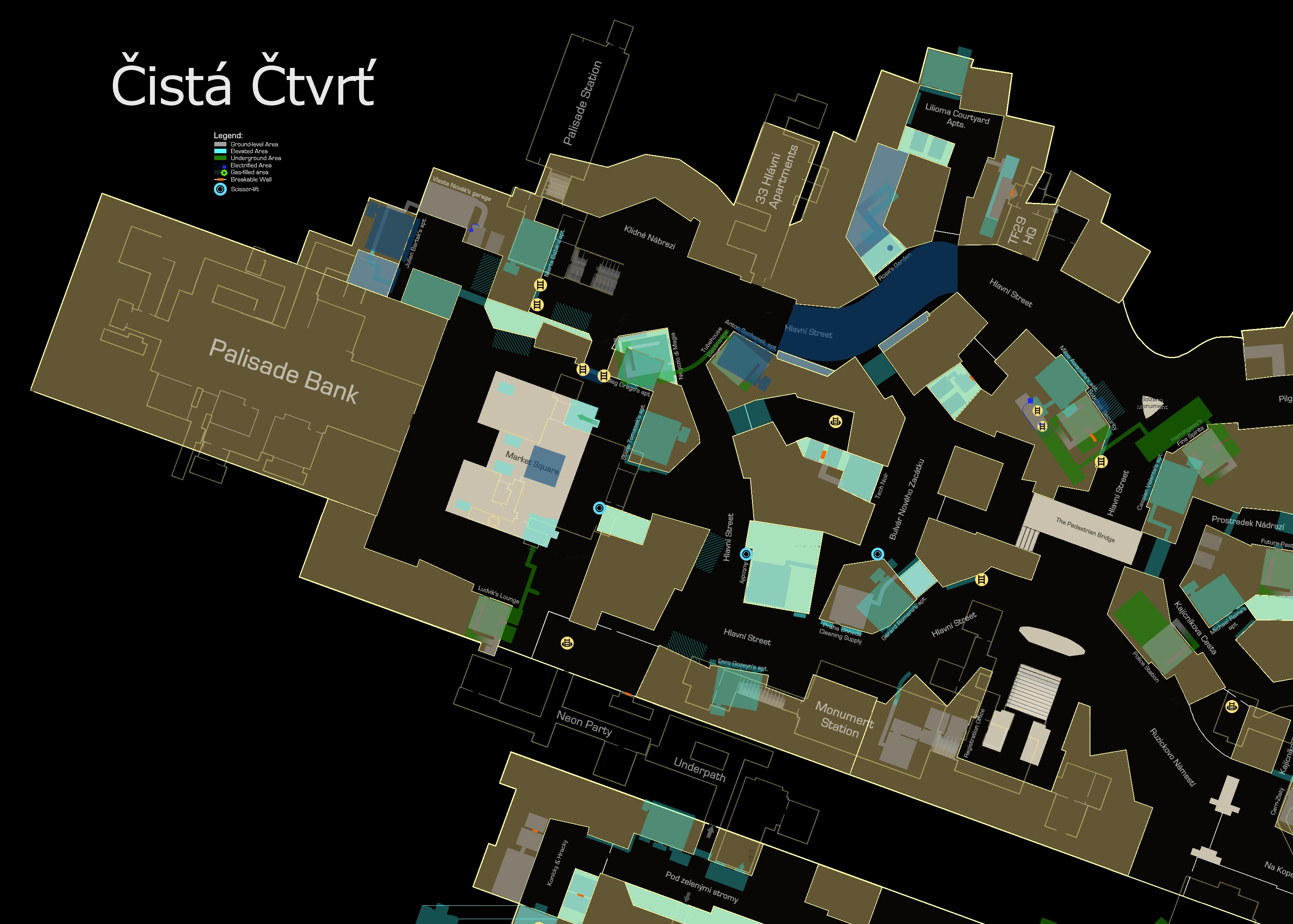- Monument Station (U Památníku Nádraží) – A metro station south of the Pedestrian Bridge and one of the landmarks marked in the in-game map.