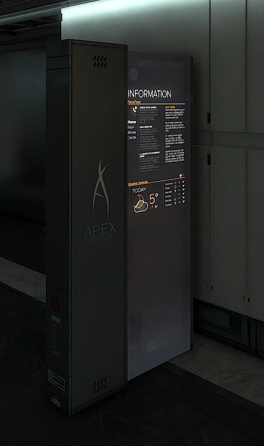 The Apex Centre NewsFeed appears on various information panels in the Apex Centre in London, in Deus Ex: Mankind Divided. The news feed contains news on current events.