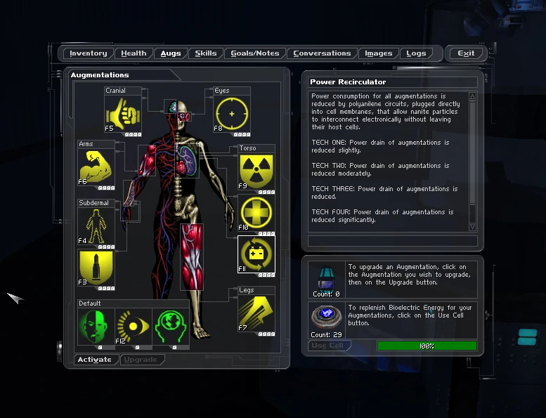 The game features 18 different nano-augmentations that the player can find. However, the player is limited to a maximum of nine: one in the arms, legs, eyes, and head; two underneath the skin; and three in the torso. Most augmentations, after being installed, can be upgraded using an augmentation upgrade canister. Upgradable augmentations have four upgrade tiers, from Tech 1 (base) to Tech 4 (fully upgraded).