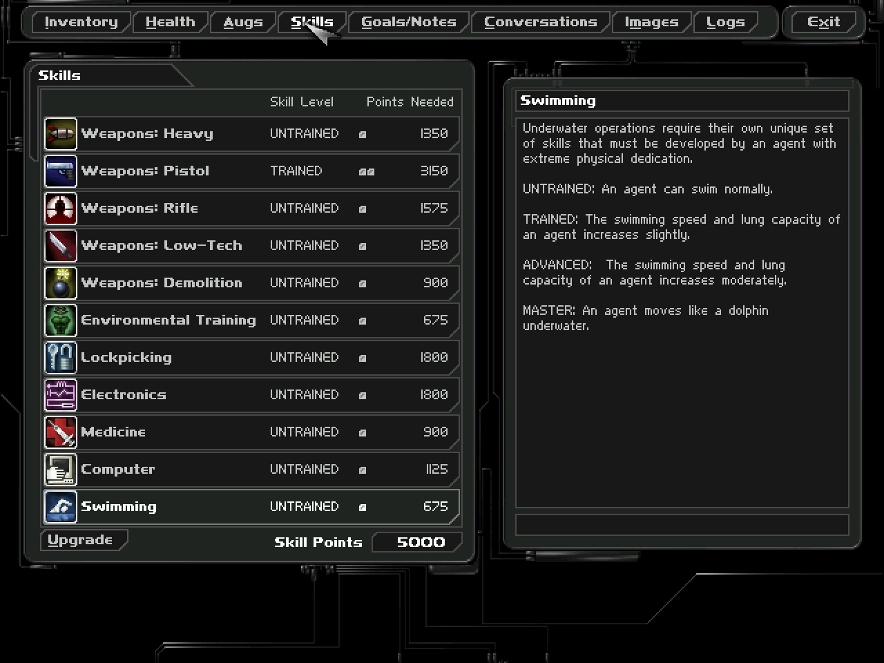 Skills define JC Denton's proficiency in using weapons and performing other gameplay functions. Deus Ex features five weapon skills, each corresponding to one of the five categories of weapons, as well as six non-weapon skills: environmental training, lockpicking, electronics, medicine, computer, and swimming. Every skill has 4 levels of proficiency: Untrained, Trained, Advanced, and Master. Compared to augmentations, which are generally active abilities, skills generally provide passive bonuses, which the exception of the hacking ability provide by the computer skill.