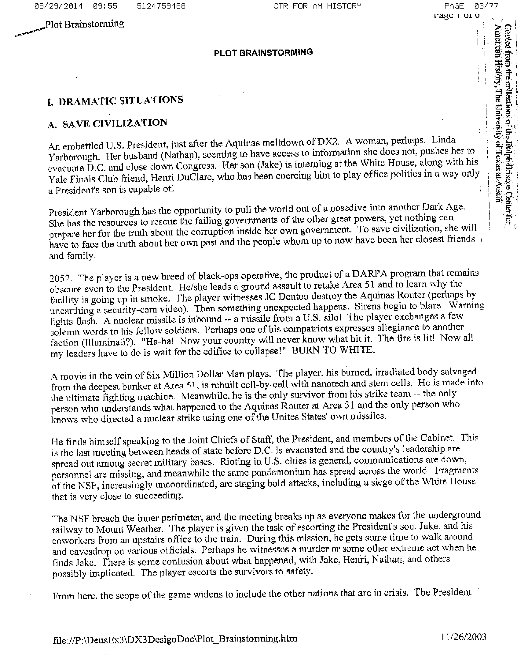 The Deus Ex 3 design document dated November 26, 2003, titled "Plot Brainstorming," is a document created by Ion Storm describing several different plot concepts for the next game in the Deus Ex series following Deus Ex: Invisible War. These concepts were never realized as an actual game, and were later replaced by different game concepts, including Deus Ex: Insurrection and a later Ion Storm "Deus Ex 3" project, projects that were ultimately cancelled as a result of Ion Storm's closure in 2005.