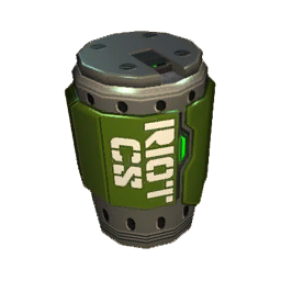 The R-Series CS Gas Discharger is a standard tactical anti-personnel gas grenade, capable of discharging CS Gas (Also known as tear gas) over a defined radius. A hand-thrown device, the grenade has no effect against inorganic targets or targets equipped with sealed environment masks or rebreather Augmentations; however, against unprotected organic targets, the discharge cloud causes temporary loss of vision and a nausea reaction.