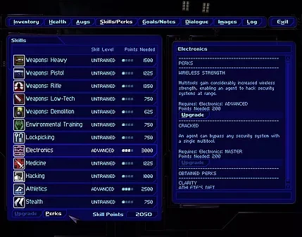 - Perks added to the skills to expand on the system and provide minor additional benefits to the player. Examples include long-range multitooling, reduced scope sway, short fused grenades, and the ability to neutralize poison with medkits.