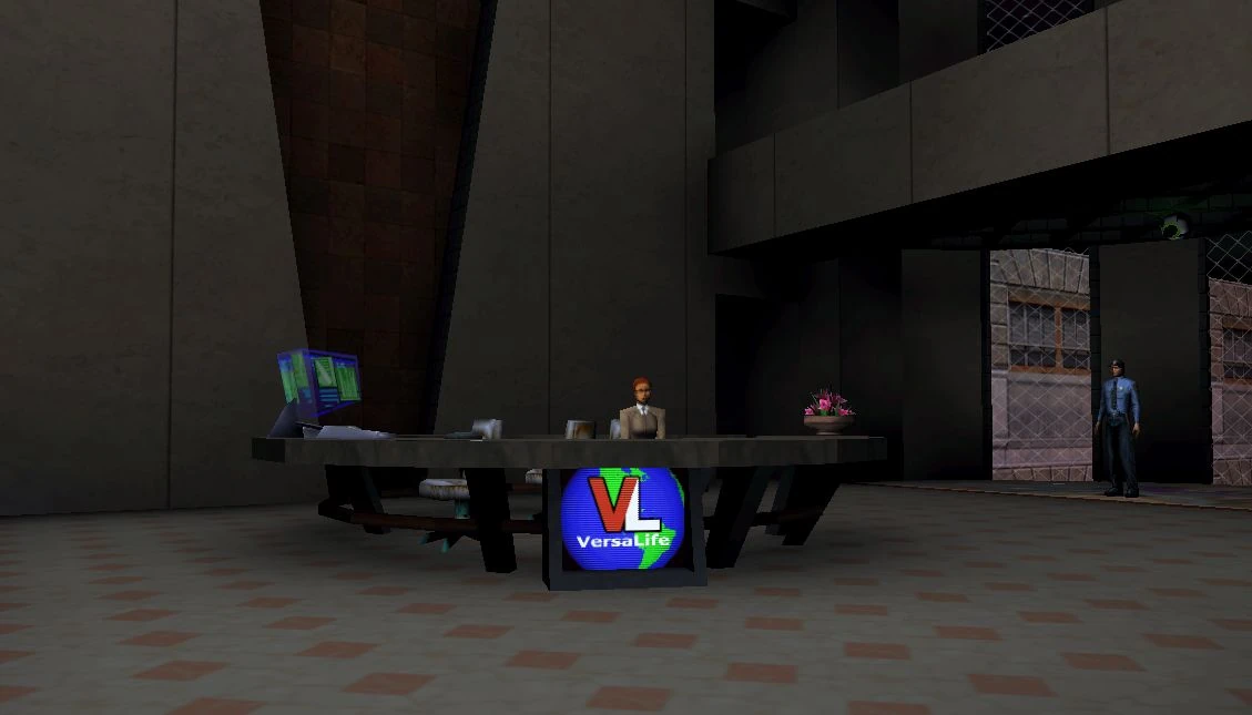 The Data Entry Facility is the first section of the Hong Kong VersaLife facility encountered by JC Denton. It can be accessed via an elevator in the Underground Mall located near the Wan Chai Market. It contains a reception area, where the visitors are greeted by the receptionist, Destiny Savannah, and several offices with data entry workers. These workers are forced to falsify the records they enter to conceal VersaLife's secret activities. Richard Hundley and John Smith are the only notable characters here. There are several security guards with pistols that will emerge from behind a one-way window if JC causes trouble. If JC returns here on the second visit, there will be a Chiang Arcbot M5 guarding the area.
