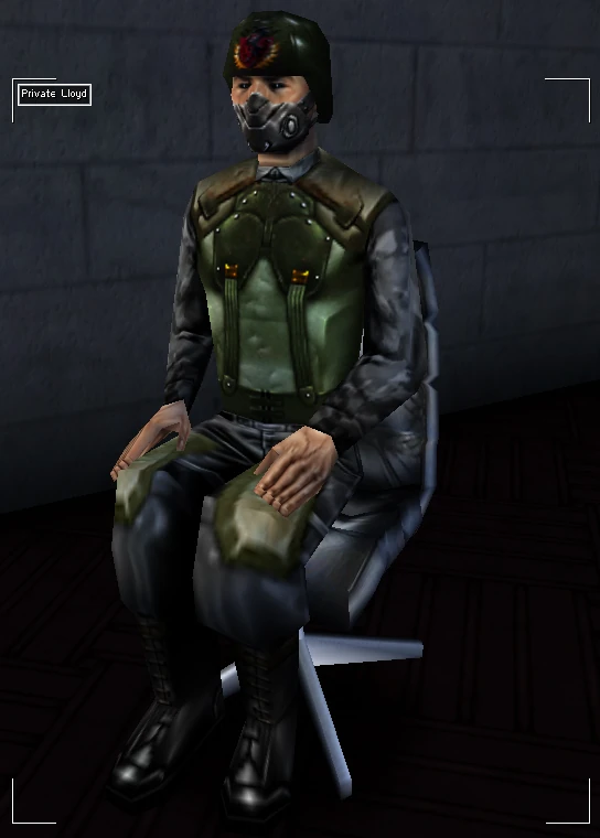 Private K. Lloyd is a UNATCO trooper who sits behind the desk in the entrance area of the UNATCO headquarters on Liberty Island.