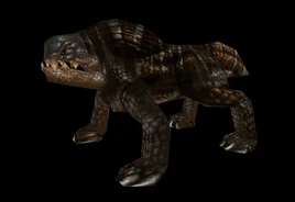 Karkians are one among the transgenic species created by researchers under the control of Majestic 12.[1] The karkian can be described as a large brown reptilian creature, approximately six feet long and two feet wide when fully grown. Its head resembles that of a crocodile. Karkians raised in captivity generally exhibit aggression toward humans.
