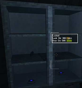 A locked cabinet in Deus Ex. Note the two meters describing the number of lockpicks needed and the physical integrity of the door.