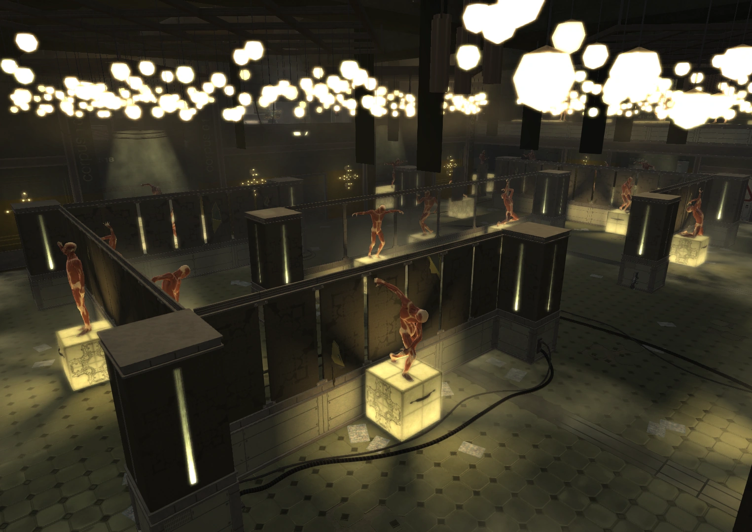 The Bio-Mech lab contains a number of offices in the upper portion of the building and research facilities in the basement. The building is protected against the spread of pathogens by a decontamination lock near the entrance. The building features a large foyer with displays of various augmentations. A glass portion of the floor allows visitors to view the surgery room below in the research labs. These labs currently house numerous test subjects brought to Omega Ranch by Belltower. Although they are alive, many of these experimentees appear to be in a dissociated state. The experiments they are subjected to often result in their deaths, as evidenced by the large number of bodies in the morgue. Declan Faherty works in this part of the building.