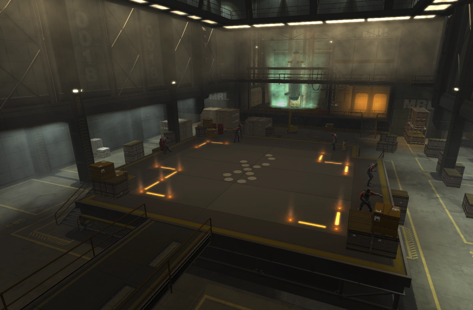The hangars are the most secure area of Omega Ranch. They are accessed via a bunker that is kept locked. These hangars hold LEO shuttle's and also have landing facilities for VTOLs and helicopters. In the lower section of this part of the compound, there is a room containing artificial models of the human muscular system. These models take on various poses that change in a cycle. A room belonging to Hugh Darrow can be found just beyond this one. Darrow's room is decorated entirely in white, including the computer monitor which normally appears orange. An elevator in this room gives access to one of the hangars, Hangar 18.