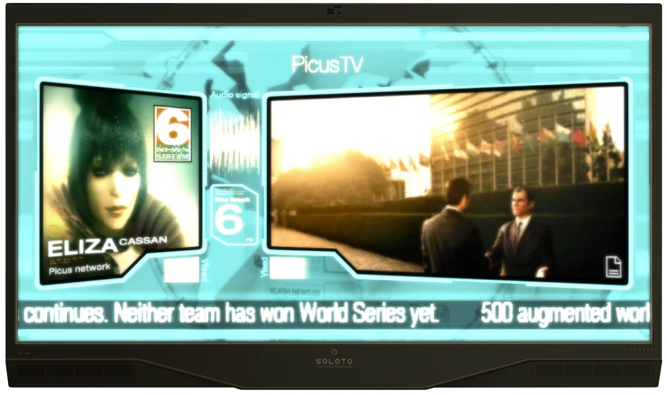 Picus Confidential fabricate footage of various "events" and projects, such as a violent scene related to the Mexican Drug War, the operations on Moon Base Omega and the activities of SpaceNet. This footage is created to mislead the public about the truth behind these topics, such as hiding the military involvement in the SpaceNet project and the true nature of Moon Base Omega. In collaboration with Picus TV and Picus Web, Picus Confidential help to further Picus' biased agenda with regards to mechanical augmentations. The propaganda campaign carried out by the division proves to be extremely successful. In certain polls, those in favor of regulating augmentations gained up to 32 points due to Picus' involvement.[11] The fabrication of footage also extends to individuals. One man claims to have proof that William Taggart has connections to anti-augmentation extremists. In order to invalidate his evidence before he can even release it, Picus plan to create a video depicting him on a racist drug-induced violent episode, or in a pornographic film.[12] It is clear that Picus Confidential have no qualms with ruining the reputation of an innocent person in order to protect the reputation of someone whose opinions line up with their agenda.