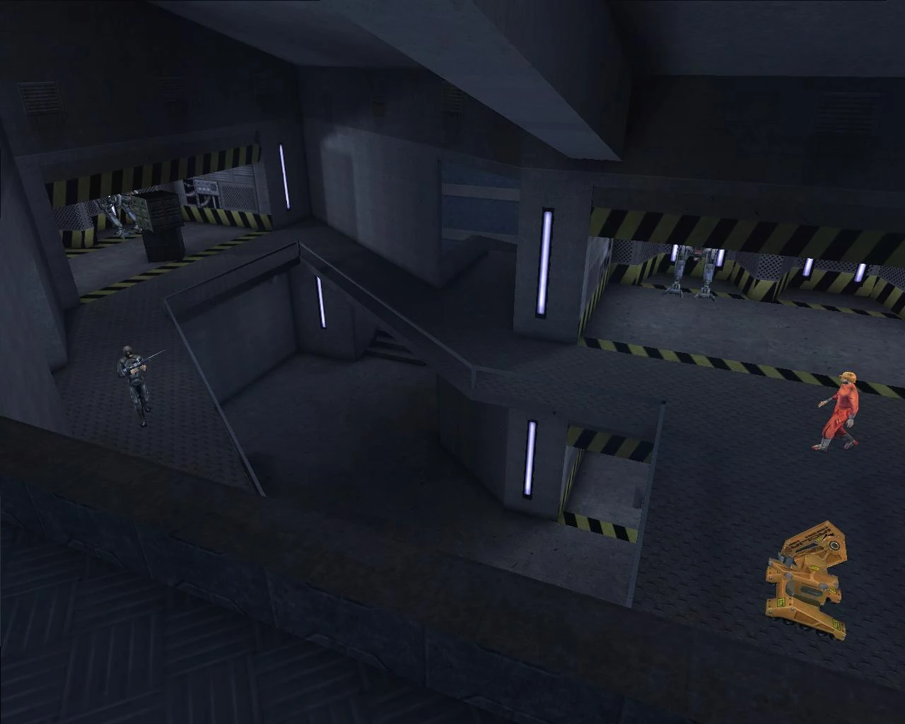 This is the area where JC Denton wakes up in a detention cell. In addition to his cell, there are three more: one containing a dead body of a NSF terrorist and a medical bot, the second holding a living terrorist named Miguel, and the third contains a crate and 2 packs of soy food. This area is patrolled by a single guard and has one security camera.