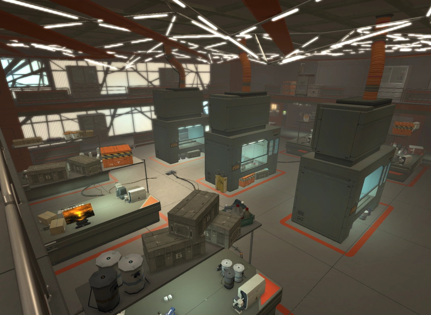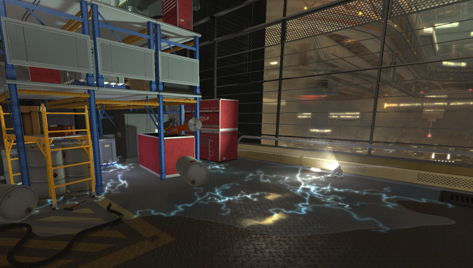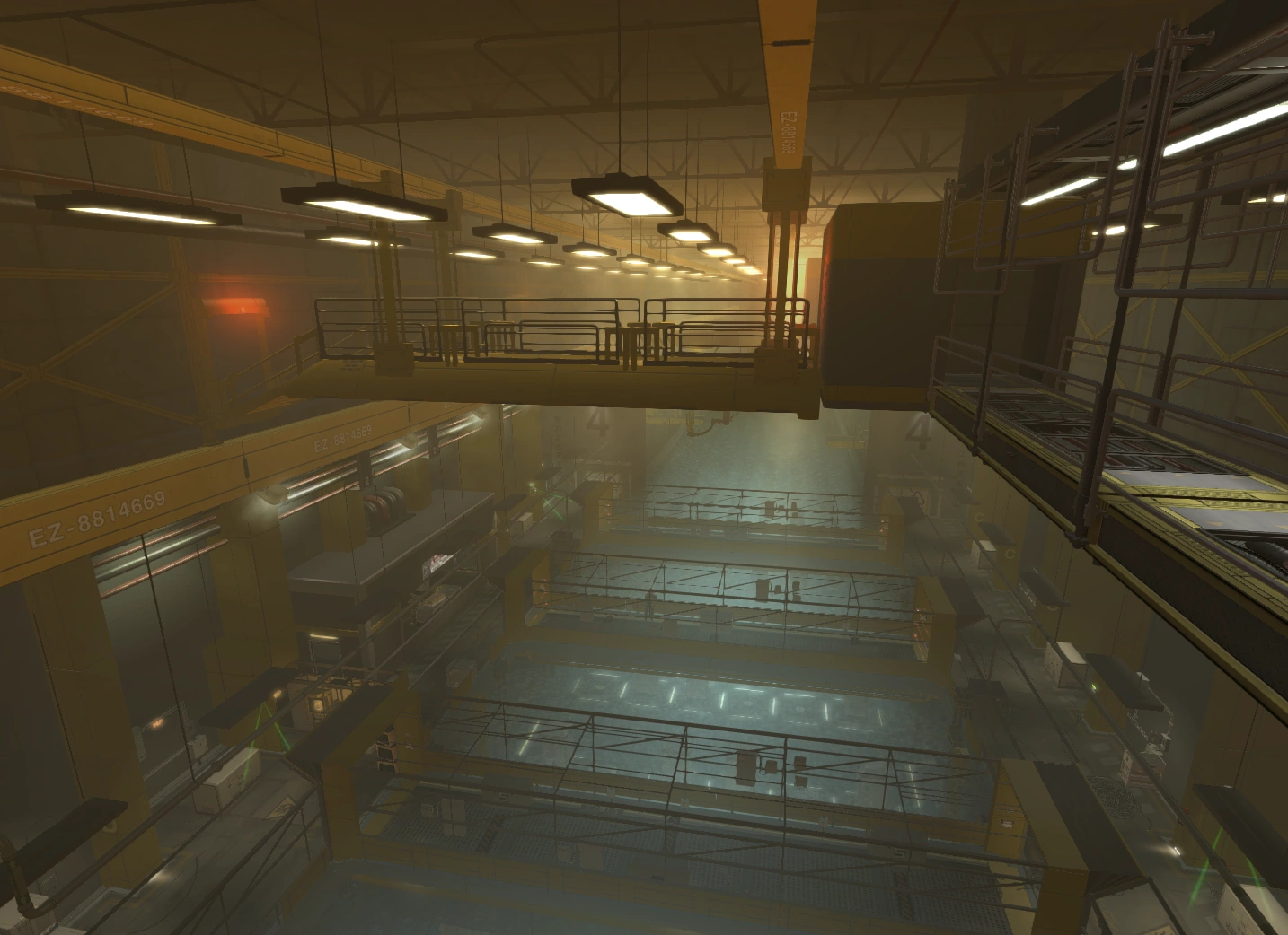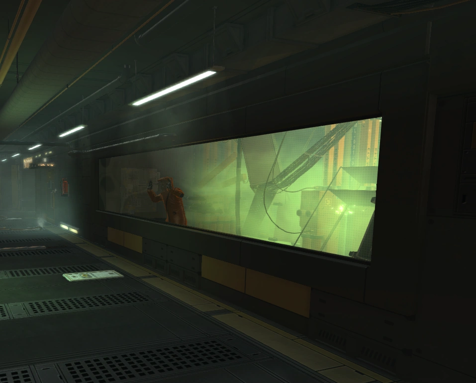 The Lower City Factory is the manufacturing floor of Tai Yong Medical and is the lowest level of the building. It is located in Lower Hengsha, directly underneath the Pangu. The factory's employees are transported via a shuttle to the entrance of the Lower City Factory. A number of chemical storage rooms are initially encountered. Beyond these is the cryo-sterilization pool, one of the major sections of this part of the building. Large containers with unknown contents are stored in this pool, presumably to be sterilized. The containers are periodically removed by a motorized arm and sent on a conveyor belt that ends in the Pangu, a storage area for TYM. Above the cryo-sterilization pool is a moveable catwalk that gives access to two storage rooms. The catwalk must first be engaged using the console in the control room overlooking the pool. The position of the catwalk can be varied to gain access to one room or the other. There are multiple pump rooms nearby that presumably supply the water for the cryo-sterilization pool. A nearby service elevator connects the lower factory to the Pangu. Access to the upper portion of the building is possible via the Pangu.