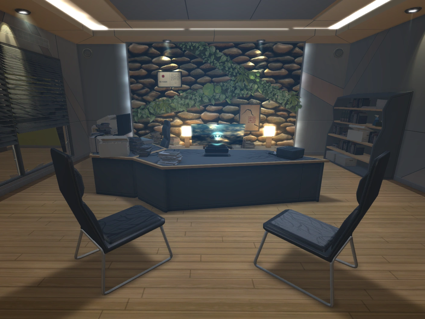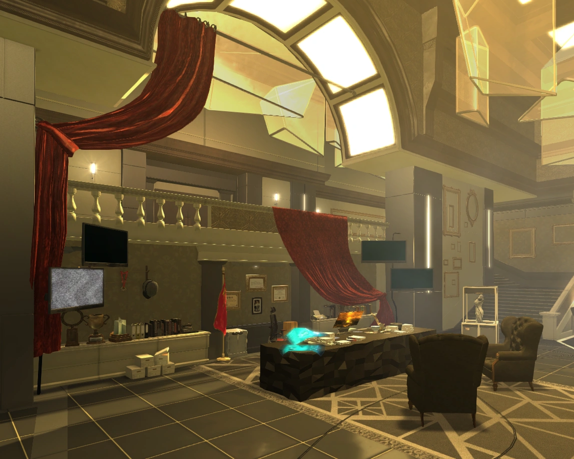 In the corridors of Upper City Management, there is a display of the timeline of TYMs augmentations. These glass cases contain an augmentation made in a certain year by the corporation. The desk of Zhang LiLi, Tai Yong's Executive Assistant, is located close to the elevator to Zhao's penthouse.