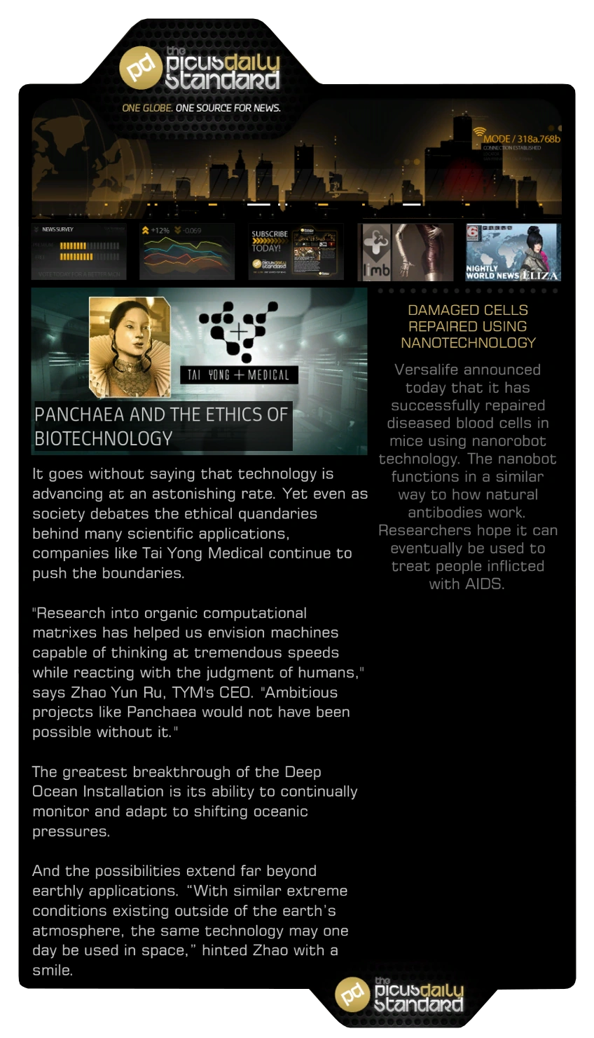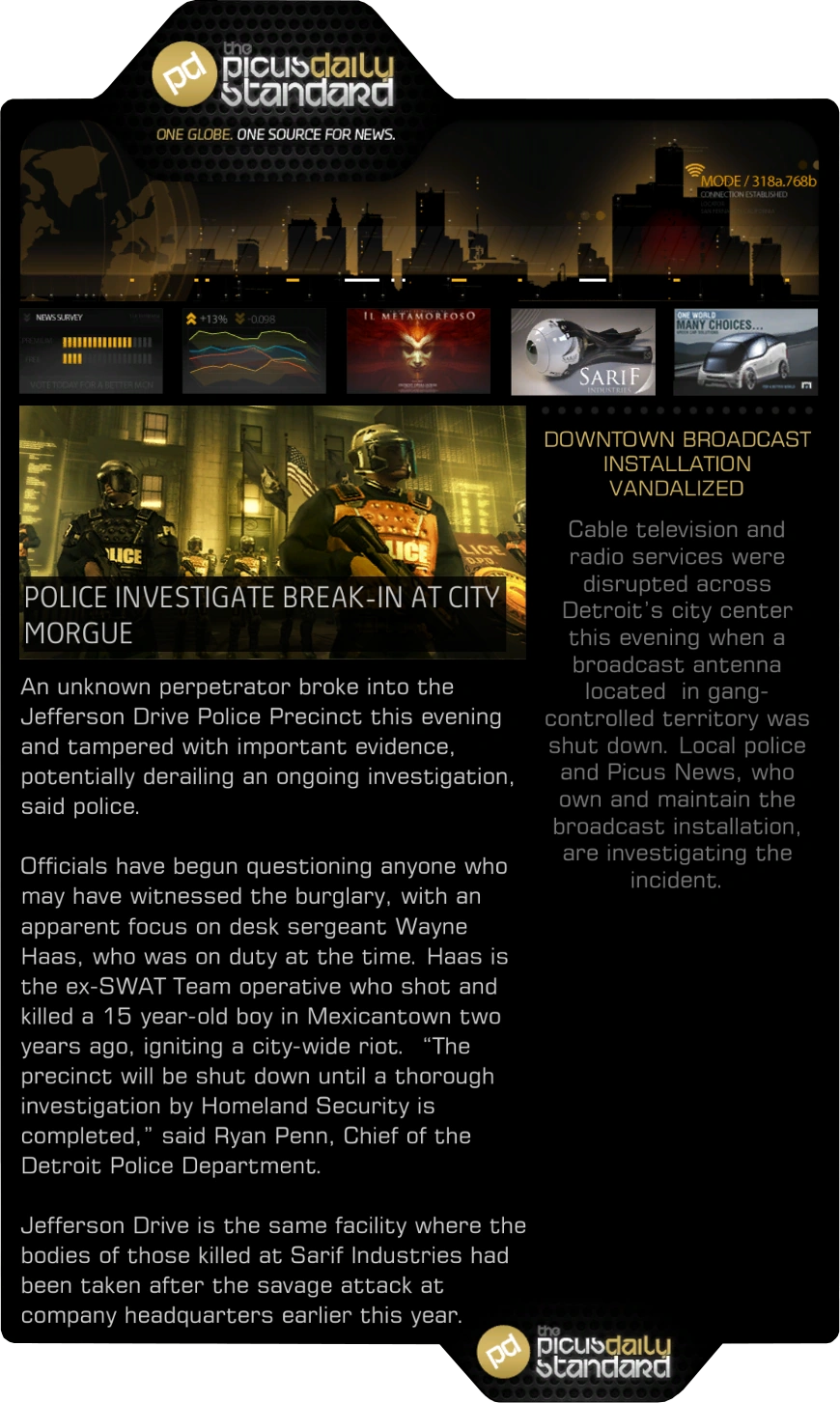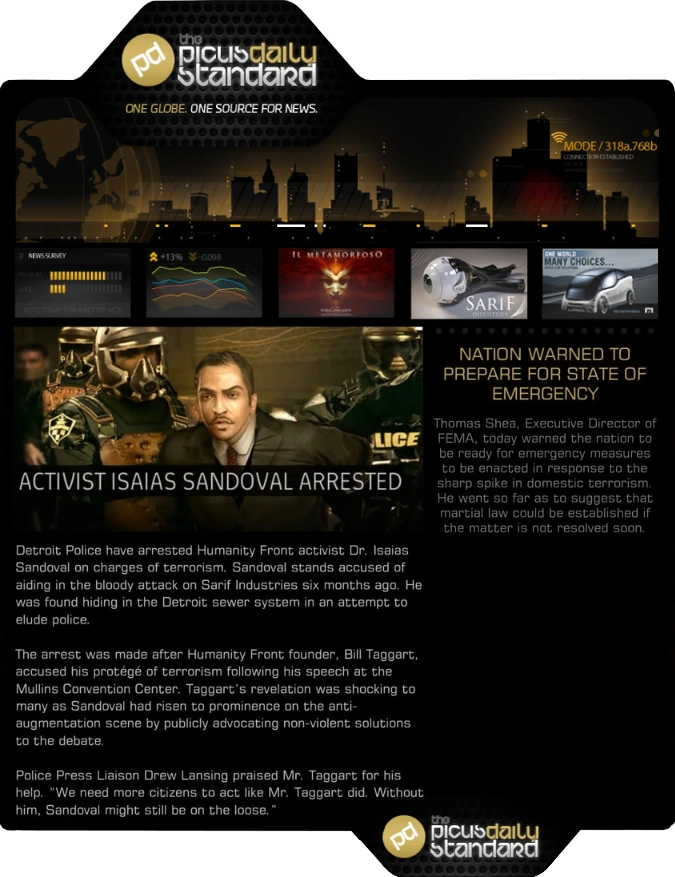 The Picus Daily Standard is a newspaper appearing in Deus Ex: Human Revolution. It is one of the largest newspapers in circulation, distributed digitally with the tagline One Globe. One source For News and published by the Picus Group.