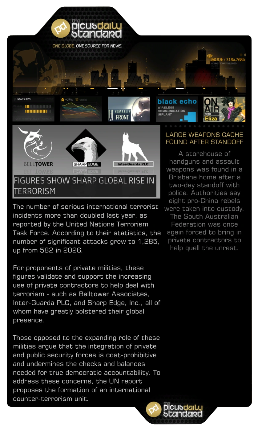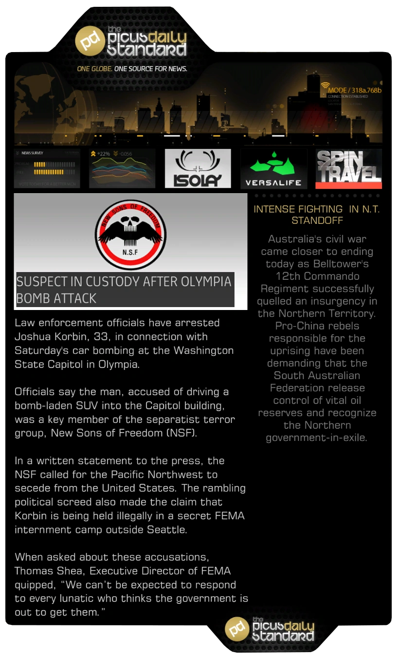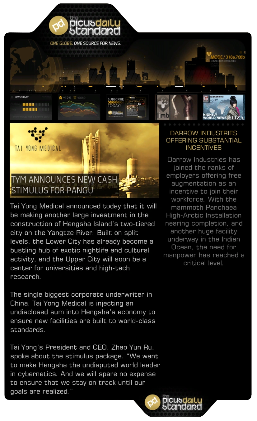 The Picus Daily Standard is a newspaper appearing in Deus Ex: Human Revolution. It is one of the largest newspapers in circulation, distributed digitally with the tagline One Globe. One source For News and published by the Picus Group.