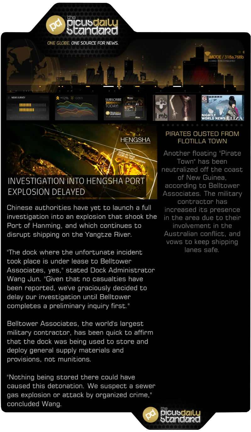 Shipping on the Yangtze River continues to be disrupted, days after a violent explosion shut down the Port of Hanming on Hengsha Island. The small dockyard, leased by Belltower Associates, sustained heavy damages. Chinese authorities believe Australian terrorists may be behind the bombing.