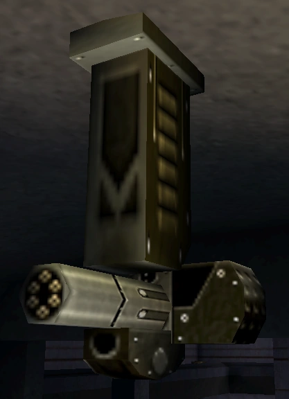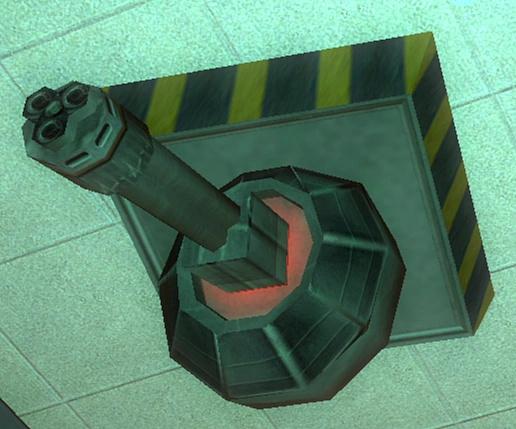 The least common turret and the most powerful. The rocket turret has an extremely long range - and will fire at the player from far away. A single rocket can kill Alex, so he/she has to be careful around these. They are always mounted to the ground.