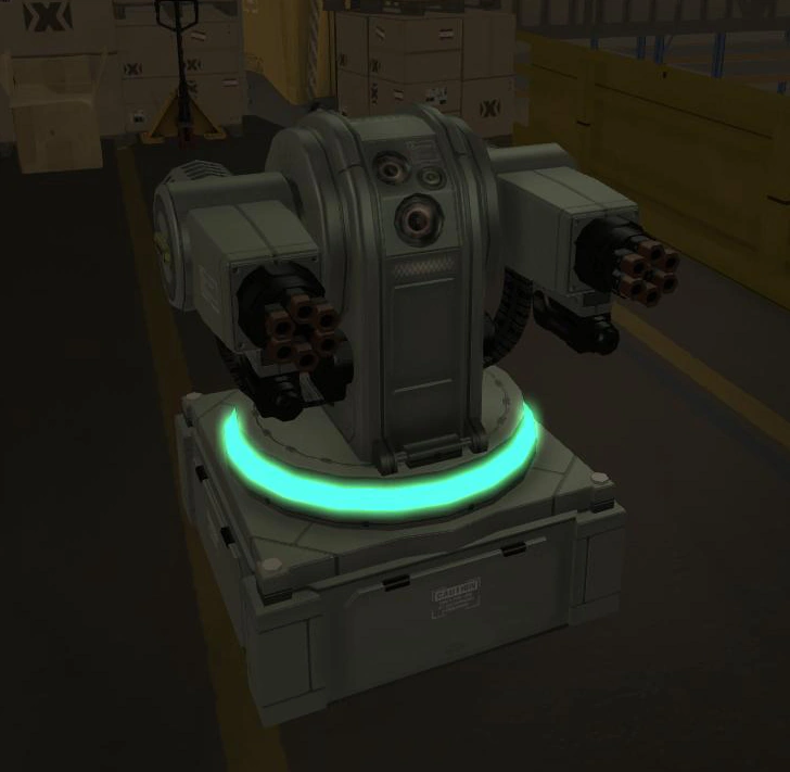 These turrets are always found on the ground and have 2 miniguns attached to the top. They have a red or blue ring at their base which shows whether the turret is alerted or not. These are not secured to the ground, so Adam Jensen may pick them up and use them as personal weapons.
